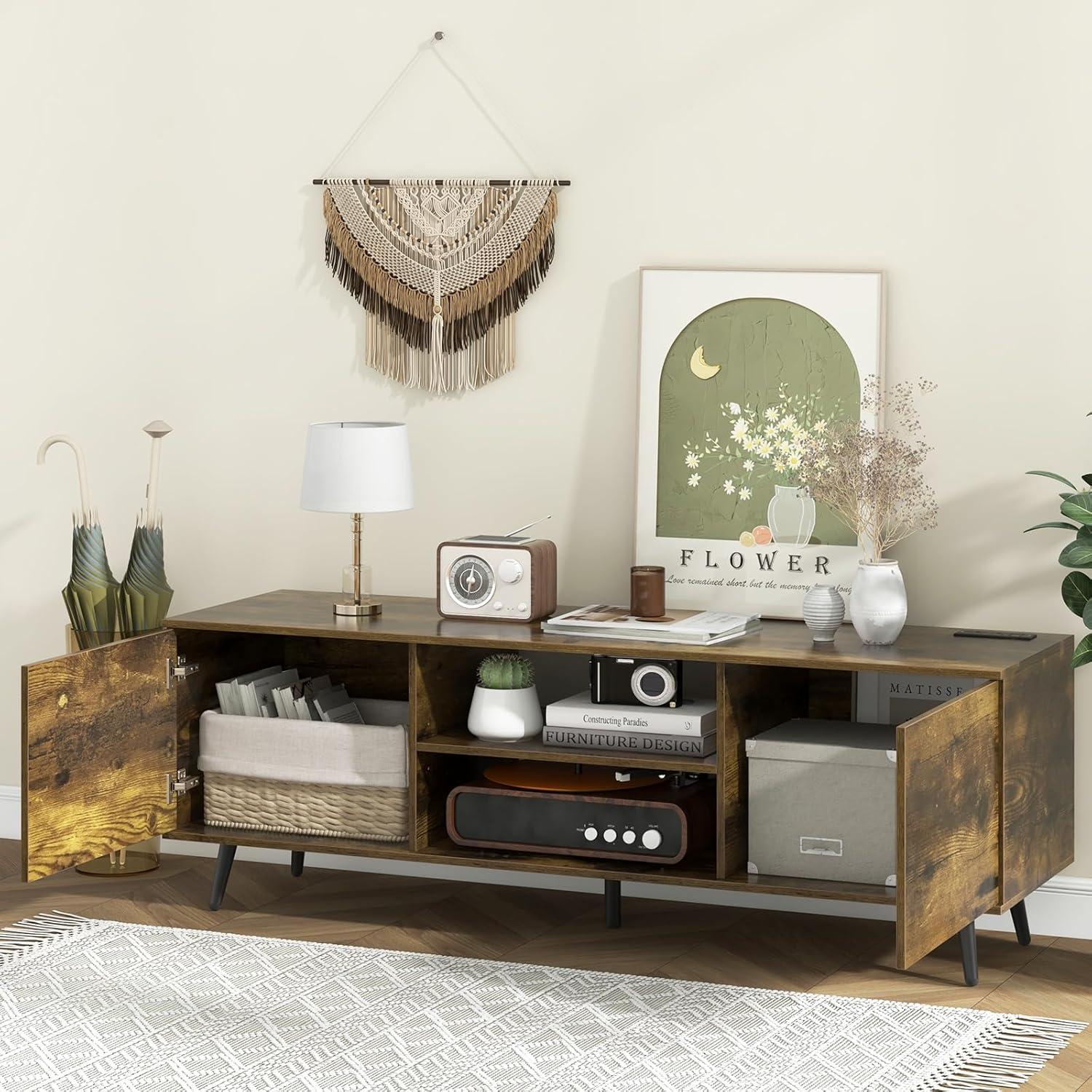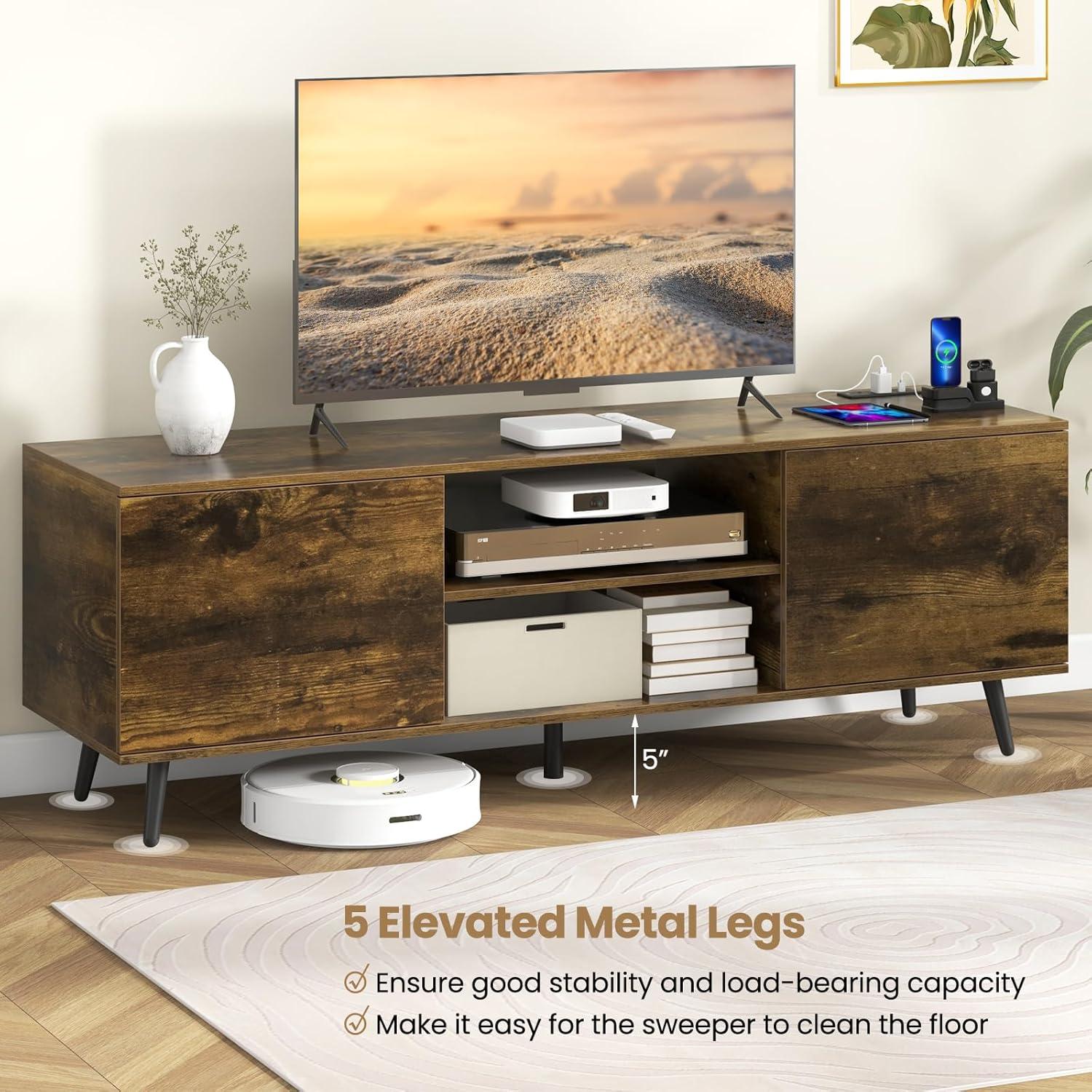This TV cabinet offers generous storage space with a spacious tabletop, 2 open shelves and 2 side cabinets, ideal for organizing media devices, books, and ornaments. The sturdy metal legs provide a stable foundation with a total weight capacity of up to 315 lbs. Thoughtful details such as a cable management hole and a adjustable shelf enhance functionality. Elevate your living room or bedroom with this multipurpose and practical TV stand, designed for modern living. Stay organized and stylish with this all-in-one entertainment solution!