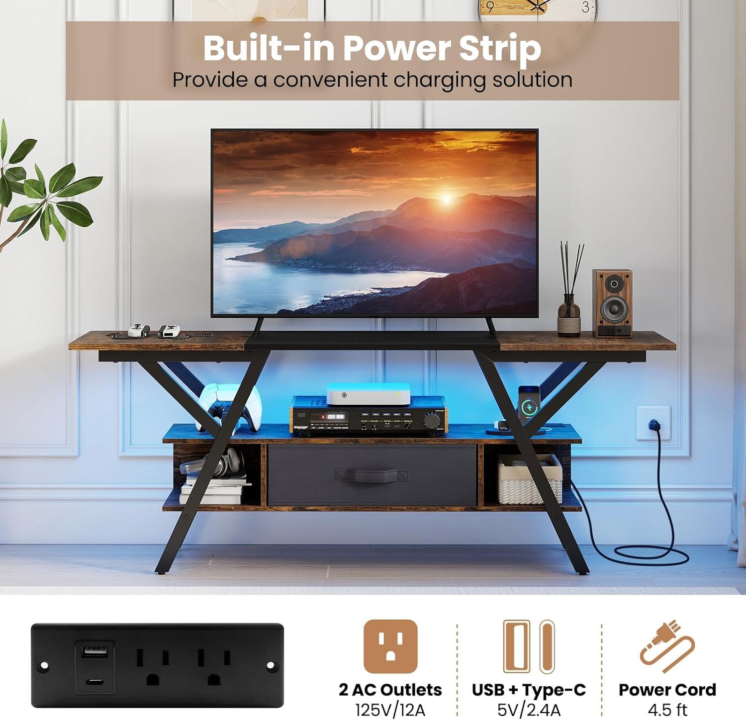 Built-in Charging Station: The modern entertainment center hides 2 AC outlets, a USB port and a Type-C port right in the middle shelf for fast, clutter-free charging. Game controllers, phones and even a laptop stay topped up, making it as practical as it is stylish.