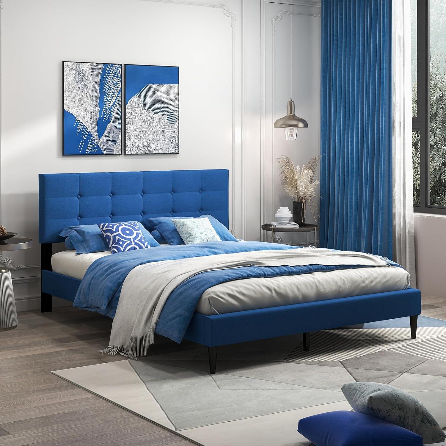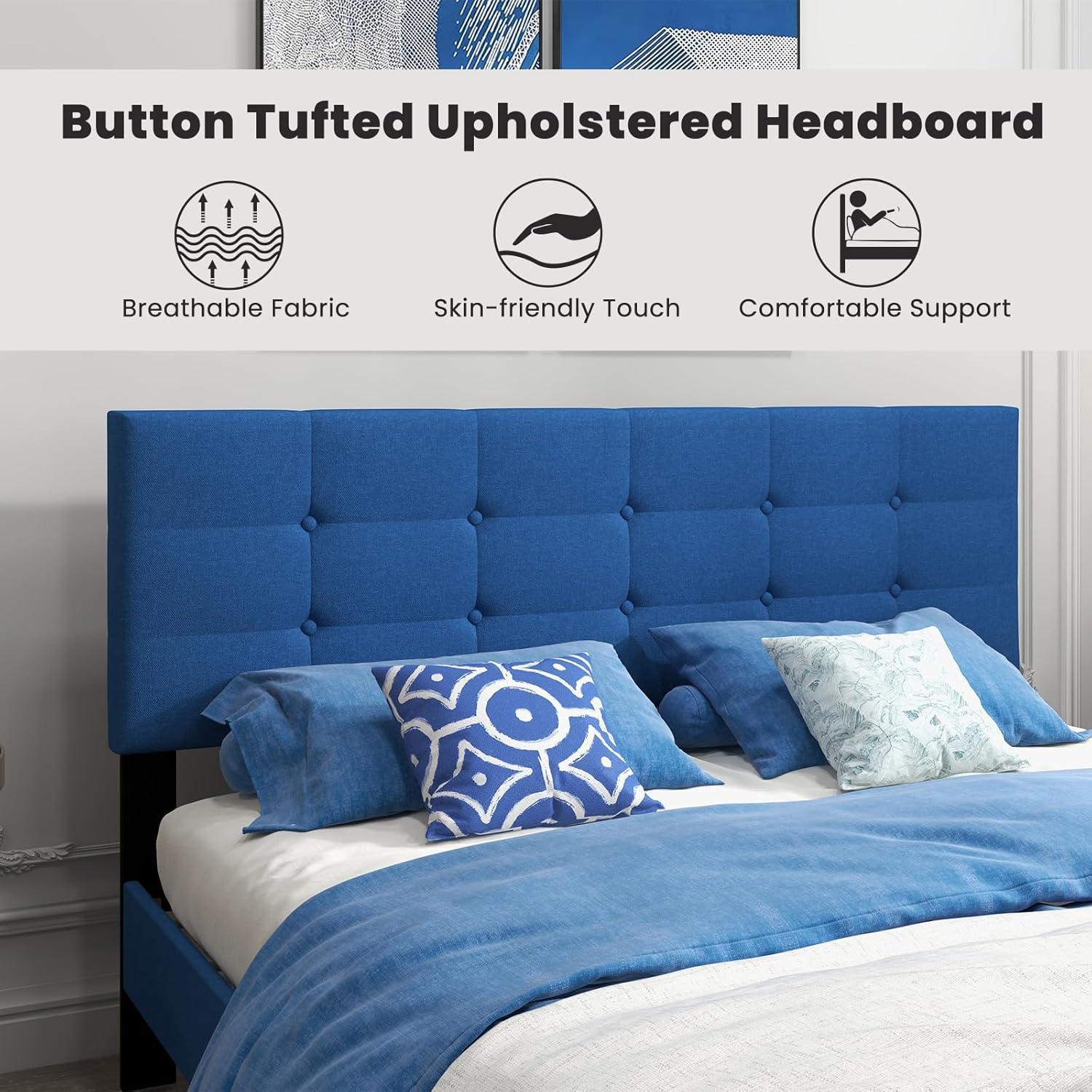 The upholstered platform bed is a beautiful and luxurious addition to any bedroom. The button tufting design adds a touch of elegance and sophistication, creating a visually appealing focal point in the room. The upholstered headboard provides a comfortable backrest for reading or lounging in bed. This bed frame does not require a box spring, as the sturdy wood slats provide excellent mattress support. Some platform beds on the market feature a flat surface and the mattress easily slides around, while our embedded design keeps the mattress in place. Additionally, this upholstered bed frame offers under-bed storage options, providing a convenient and organized solution for keeping shoes, storage boxes or other items. With its stylish design and comfortable features, the upholstered bed frame with a button tufted headboard is a perfect blend of functionality and elegance for your bedroom.