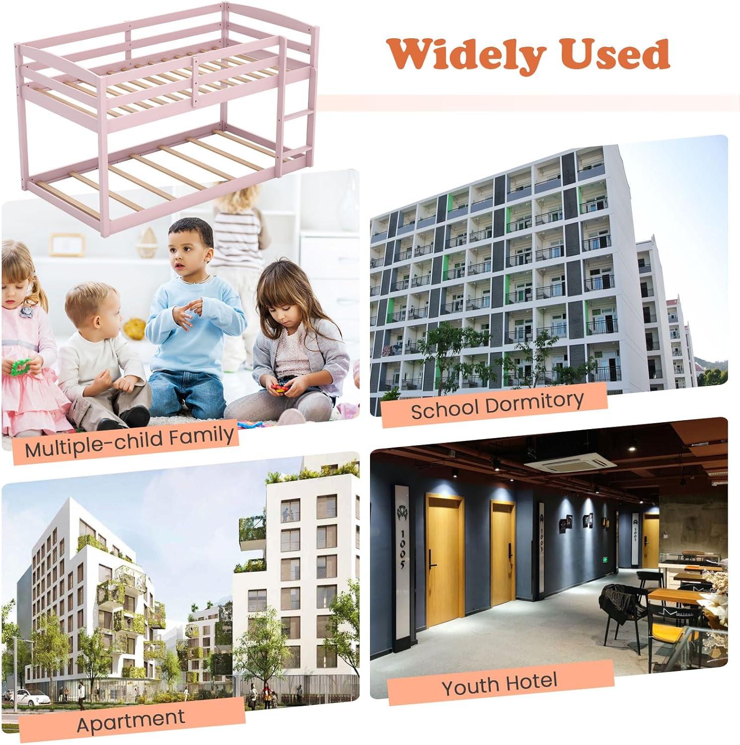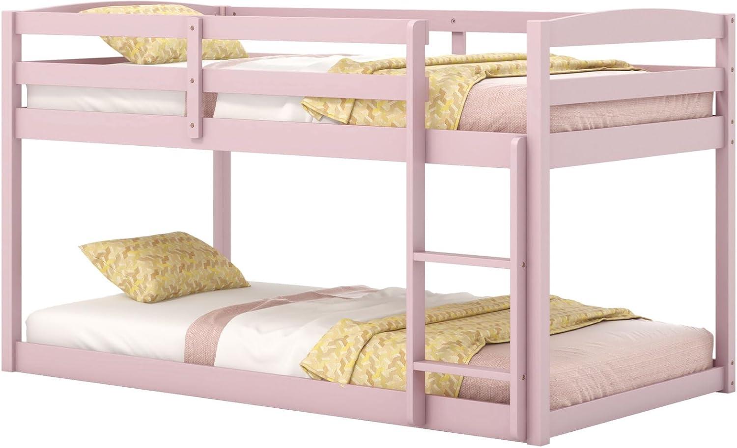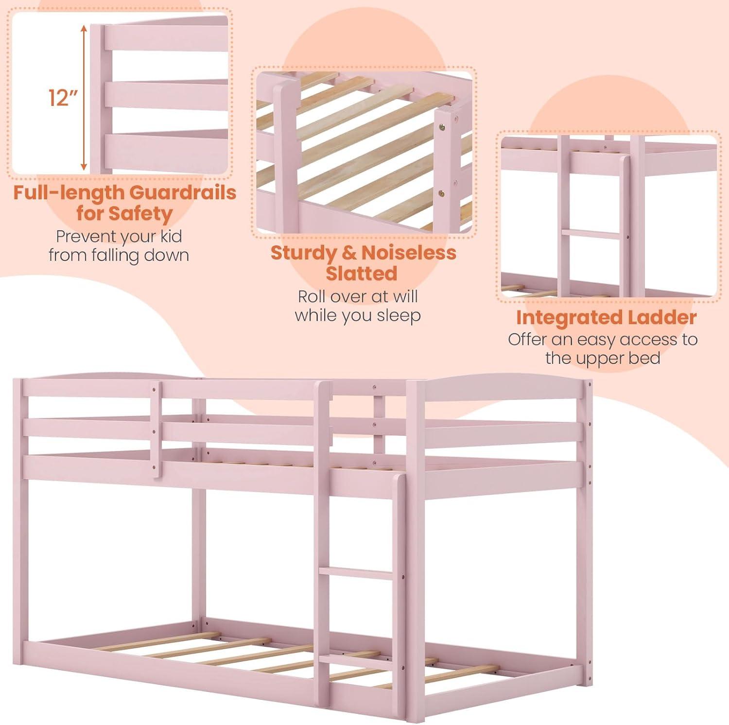 Giantex Twin Low Bunk Bed, Solid Wood Twin Over Twin Bunk Bed Frame with Full Guardrails & Integrated Ladder, Floor Twin Bunk Beds for Kids Boys and Girls, No Box Spring Needed, Natural(Pink)