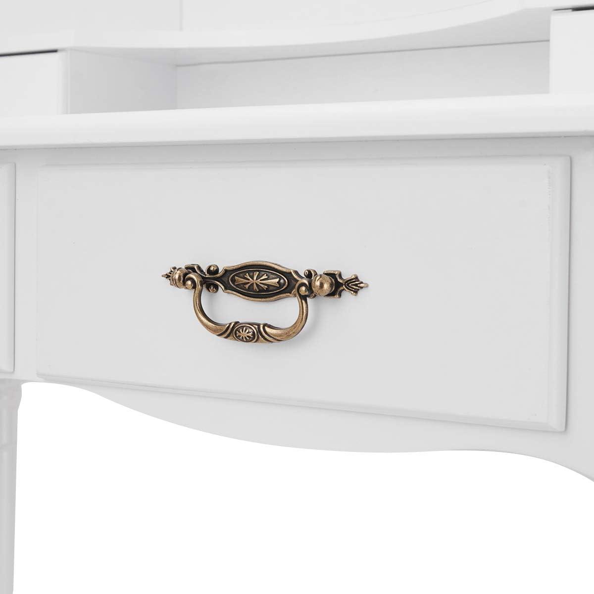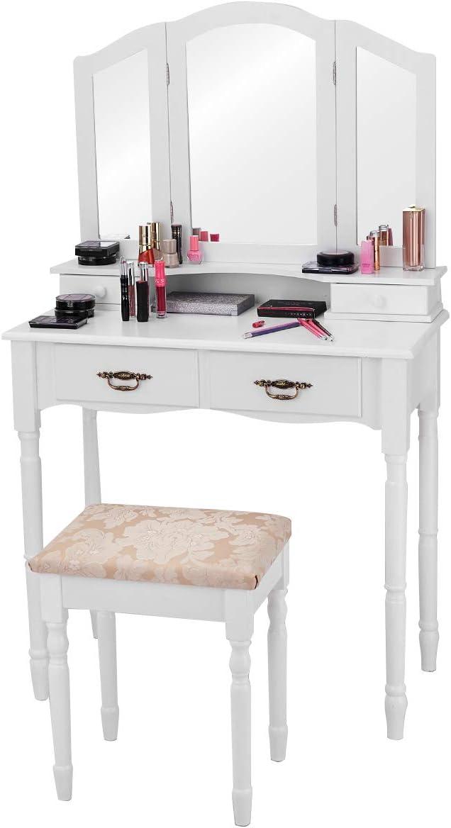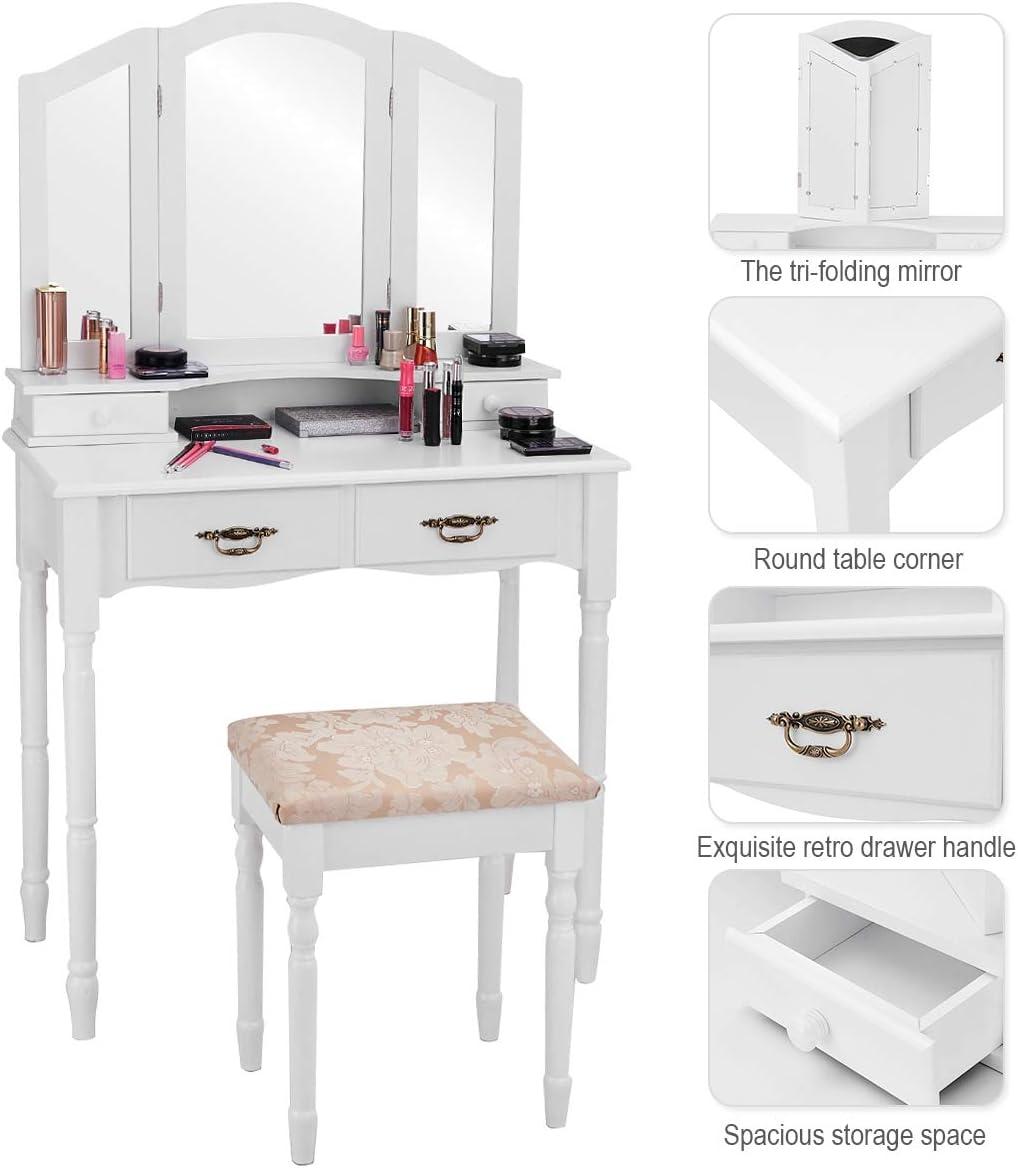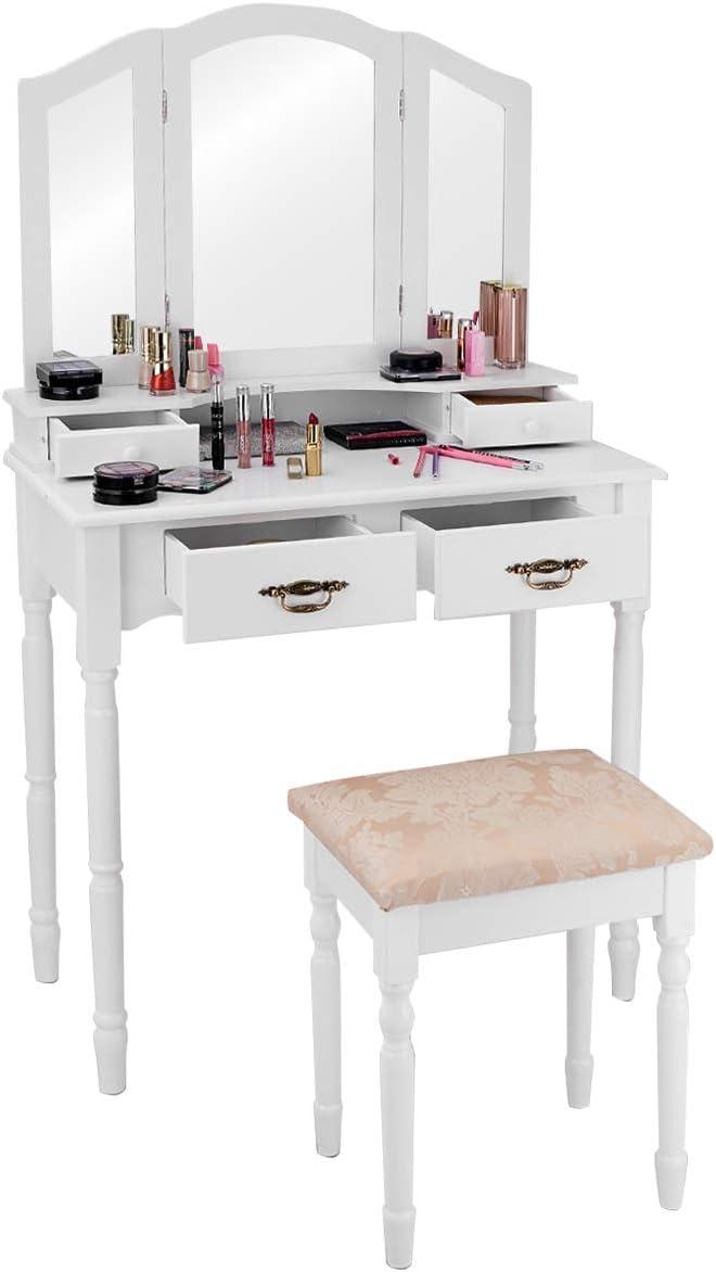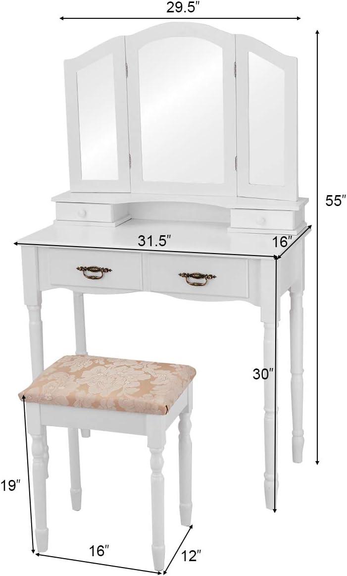 Giantex Vanity Set Makeup Table with Stool, Dressing Tables with 4 Drawers, Tri-Folding Mirror, Large Mirrored Room Vanity Desk for Bedroom Bathroom Padded Seat Chair Vanities, White