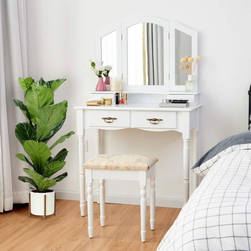 【4 Functional Drawers and Tri-Folding Makeup Mirror】If you like a dressing table with a lot of drawers, then you will like this one, the 2 small drawers on the table can be completely removed, you can put lipstick, eyebrow pencil and other items, 2 large drawers under the table are for other larger cosmetics. There is tri-fold mirror on the table, which can be used as both make-up mirror and dressing mirror. It is very practical and convenient.