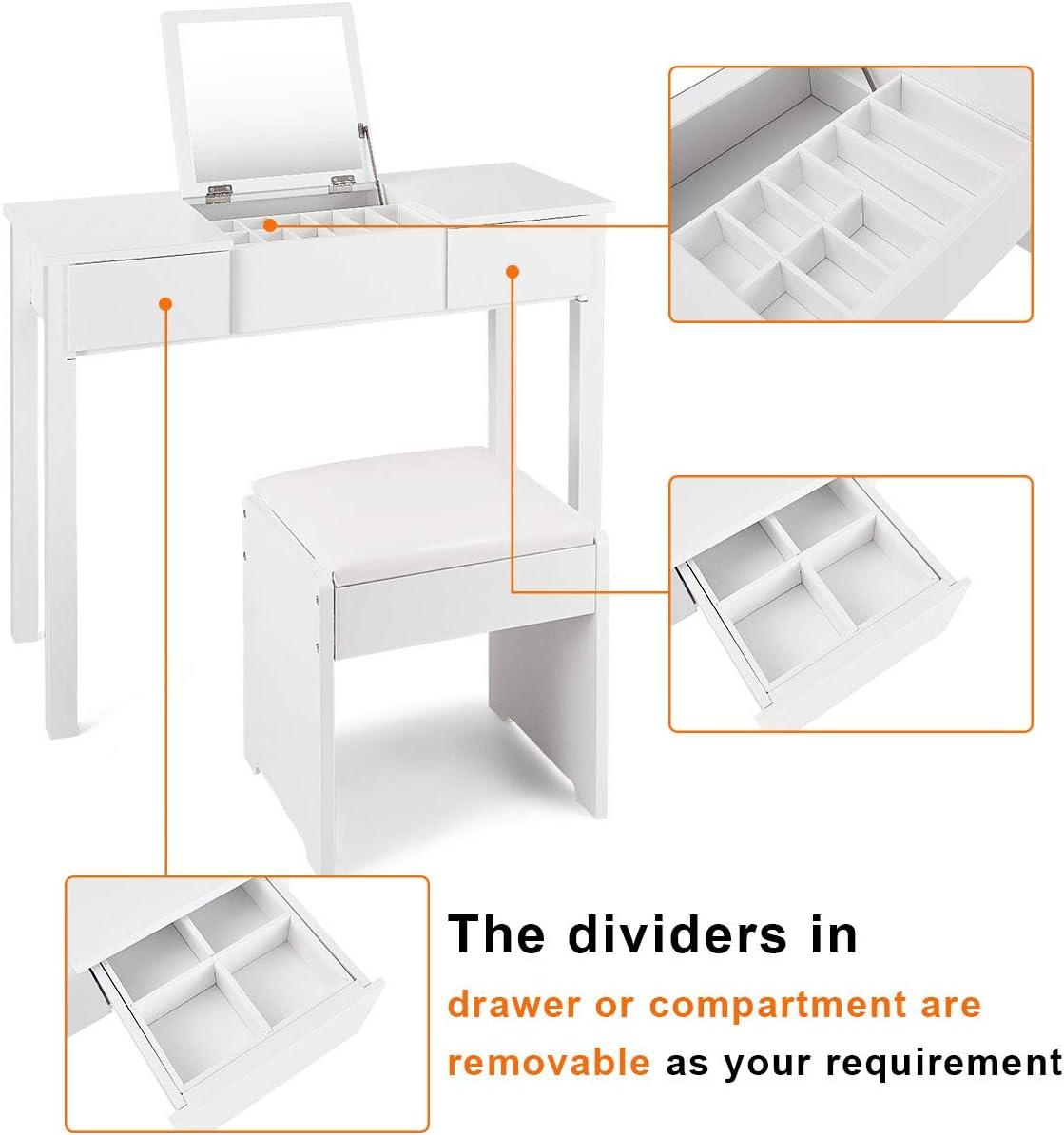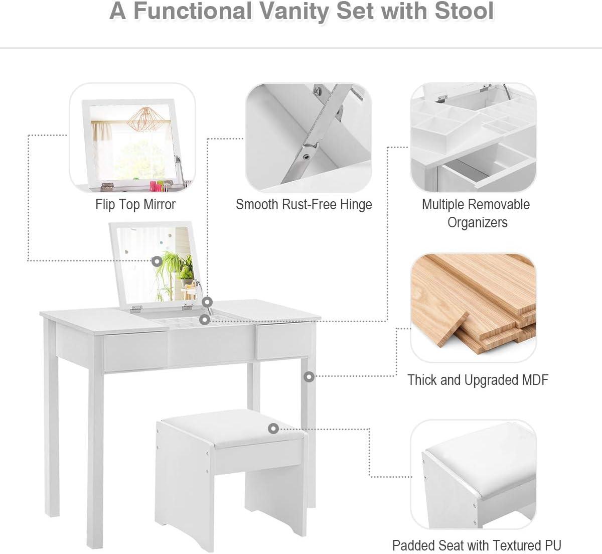 Giantex Vanity Set with Flip Top Mirror and Cushioned Stool, Makeup Dressing Table Writing Desk with 2 Drawers & 3 Removable Organizers, Makeup Table Set Easy Assembly, White(White)