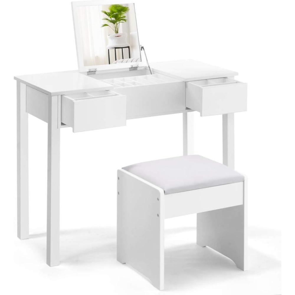 Giantex Vanity Table Set with Flip Top Mirror and Cushioned Stool, Folding Top Flip Mirrored Large Storage Organizer for Home Bedroom Bathroom, Makeup Dressing Table Set with 2 Drawers, White
