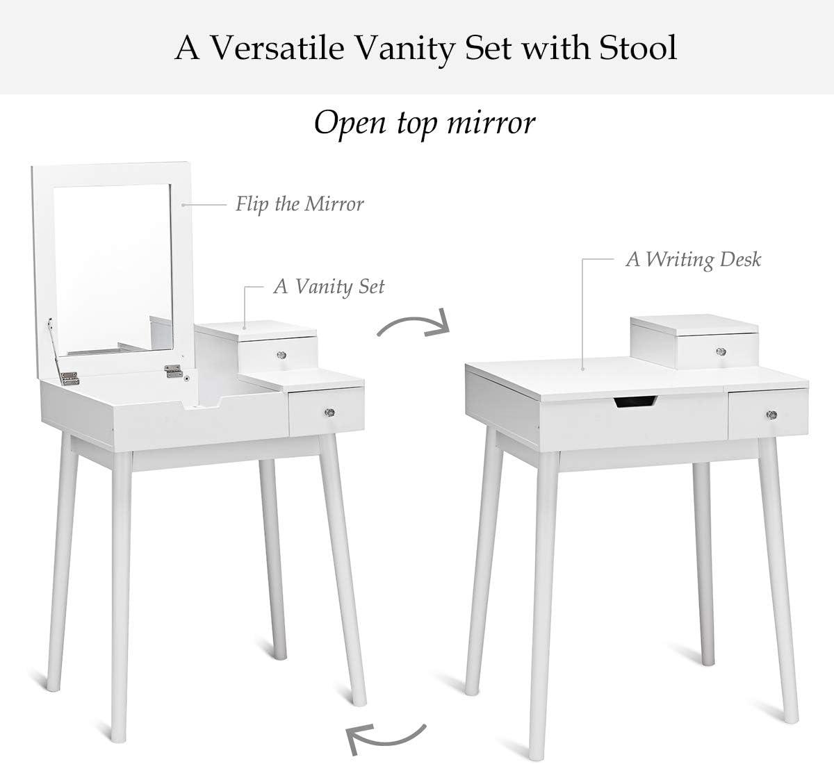 【Top Flip Mirror to Save Space for Functional Writing Table】The mirror on the top of the vanity table can be flipped to be a writing desk. When open the lid, it can be used as a dressing table with a makeup mirror. One table for both purposes, which saves desktop space and increases internal storage space. Functional and beautiful.