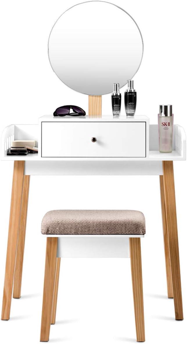 【Stable Vanity and Real Glass Mirror】The vanity features a round large makeup mirror with real glass material for true reflection. The mirror is adjustable with 2 heights. The hardware we use is customized.The whole vanity with stool has stable base due to wood material and smart designs. If you want a delicate vanity. This one is for you.