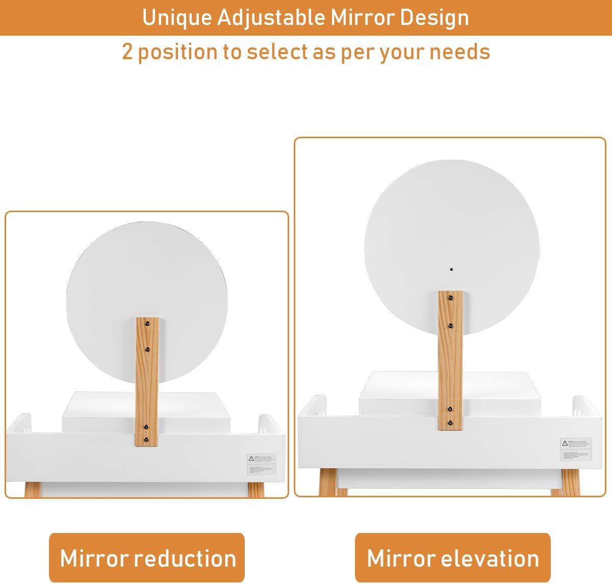 【Height Adjustable Round Mirror】The mirror is placed at a certain height and not directly placed on the vanity table. It helps you have a appropriate height for daily use. Besides, the mirror height can be adjusted in two positons for different people. There are two rows of holes beside table to help you to thread the hair-dryer cord. And there is a round knob on the drawer to make operation easily.