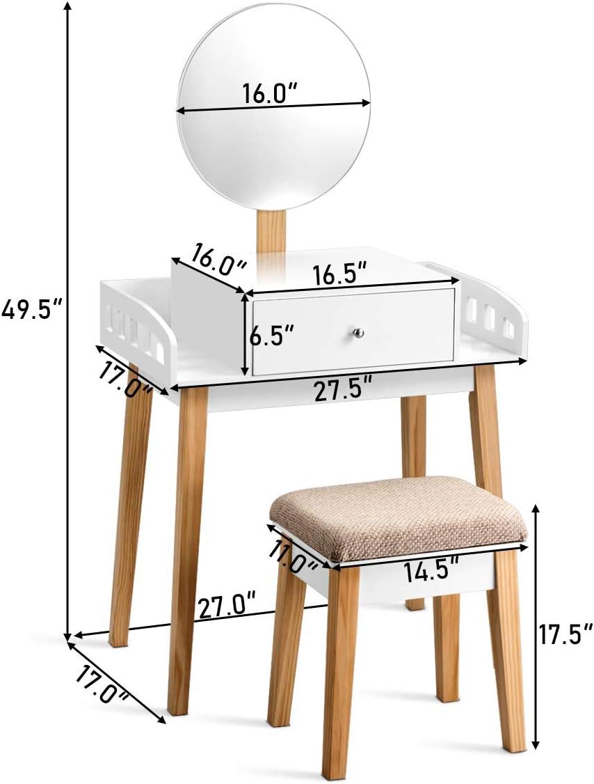 【Natural Style and Durable Wood Legs】The dressing table and stool legs are made of pine wood for durability. The natural wood color perfectly matches the white vanity. Besides, the stool has also carefully selected with linen as seat fabric, super super natural and fits the vanity table.