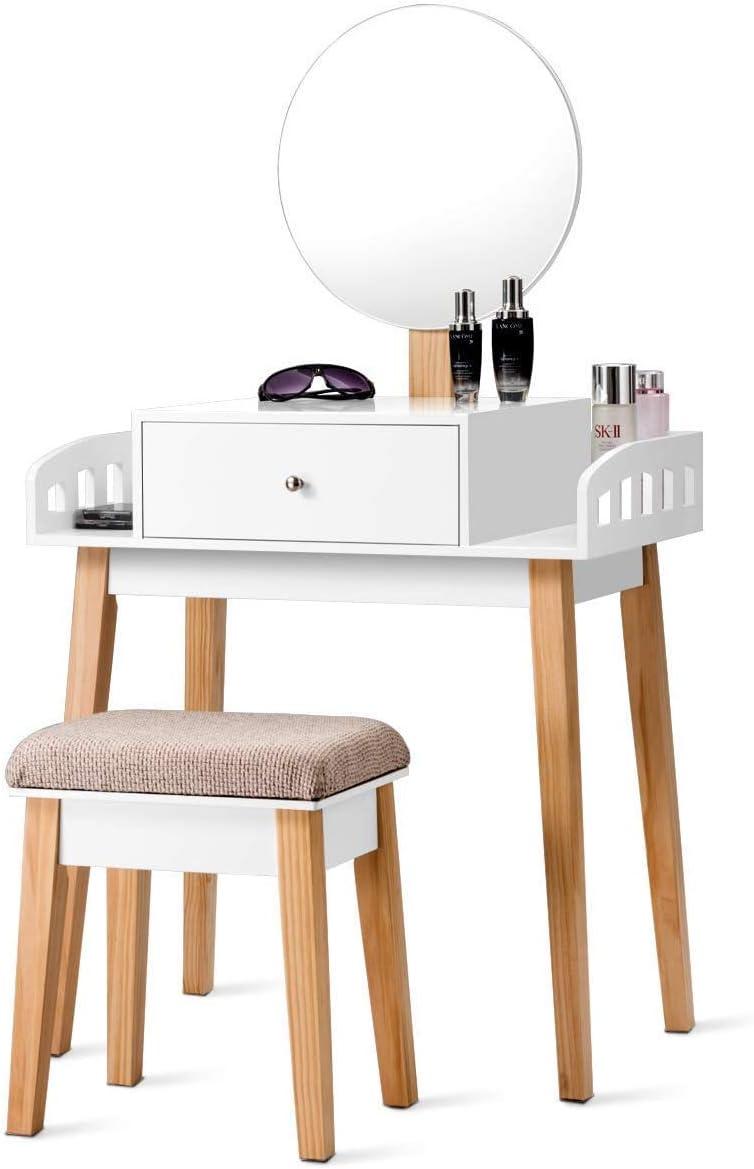 Giantex Vanity Table Set with Height Adjustable Round Mirror, Makeup Mirrored Dressing Table with Cushioned Stool, Side Storage and Large Drawer, Gift Vanities for Women Girls Bedroom (White)