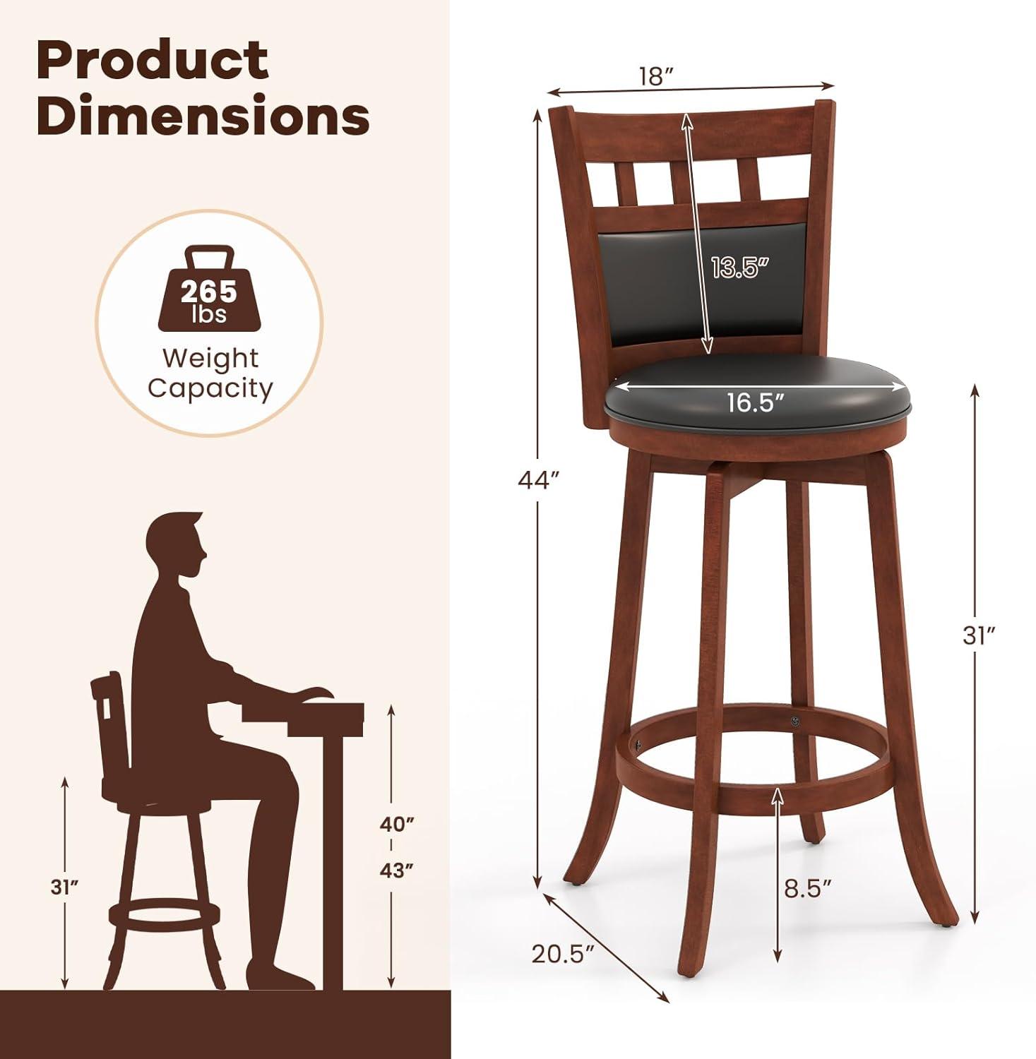 Giantex Wood Bar Stools Set of 2, 31" Swivel Bar Height Barstools w/Back, Rubber Wood Frame, Padded Seat, Footrest, PVC Leather, Wooden Counter Bar Chairs for Kitchen Island, Restaurant, Espresso(1)
