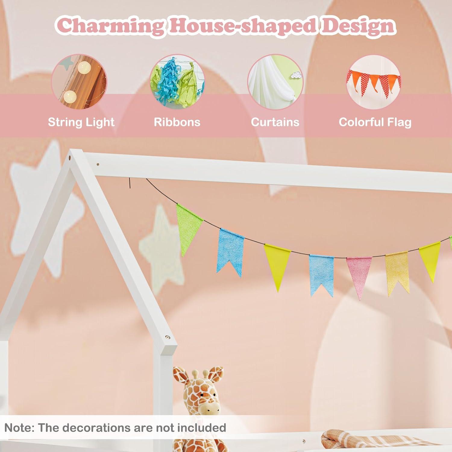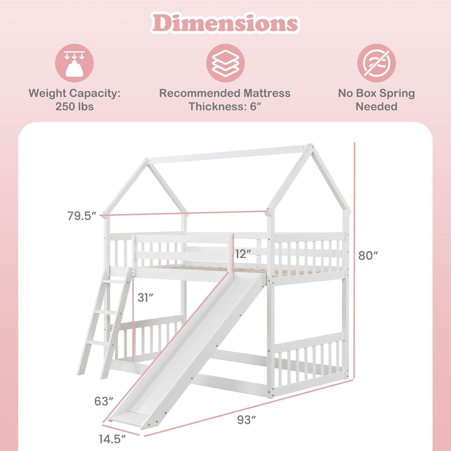 This twin over twin bunk bed features a fun slide, encouraging active play and making bedtime an adventure. The charming house-style frame adds a whimsical touch to any room decoration. Built from solid wood and equipped with 14 rugged plywood slats, this bunk bed is built to last. Besides, the reversible slide and ladder design adds an element of excitement to bedtime while also providing easy access to the top bunk.Prioritize your child's safety with full-length guardrails. This low floor bunk bed frame offers an ample high under-bed space, perfect for storage, sleeping or creating a cozy play area. It is an inviting addition to any room, where dreams and play come together seamlessly.