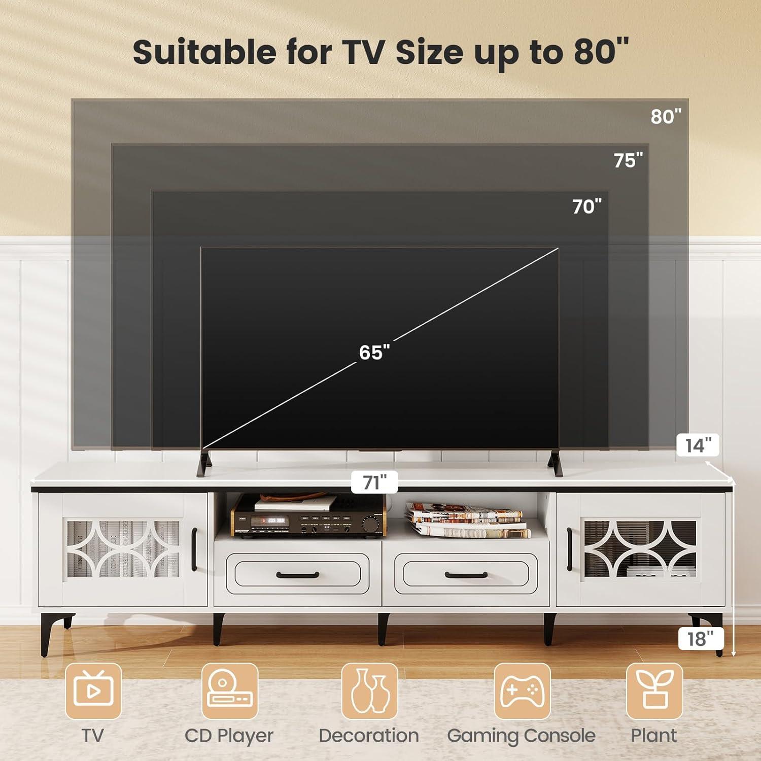 [Accommodates Large TVs]: Equipped with a 71″ spacious tabletop, the modern TV stand is perfectly suitable for TV size up to 80″. The large tabletop offers ample space for your television and additional decorative items, ensuring that your living area is both functional and stylish.