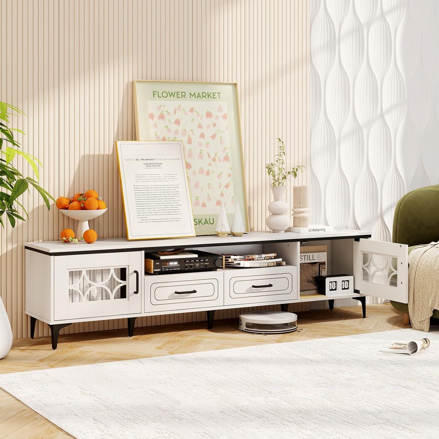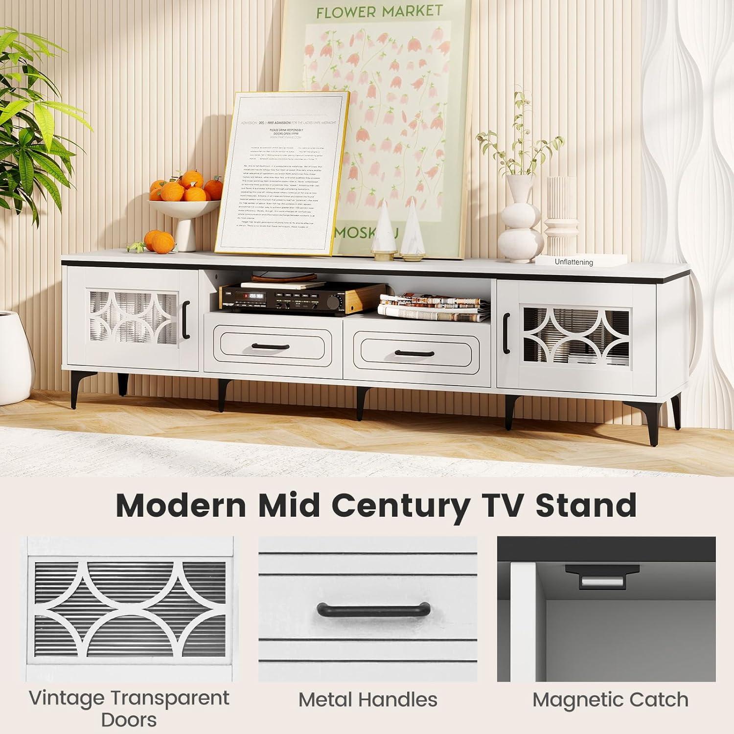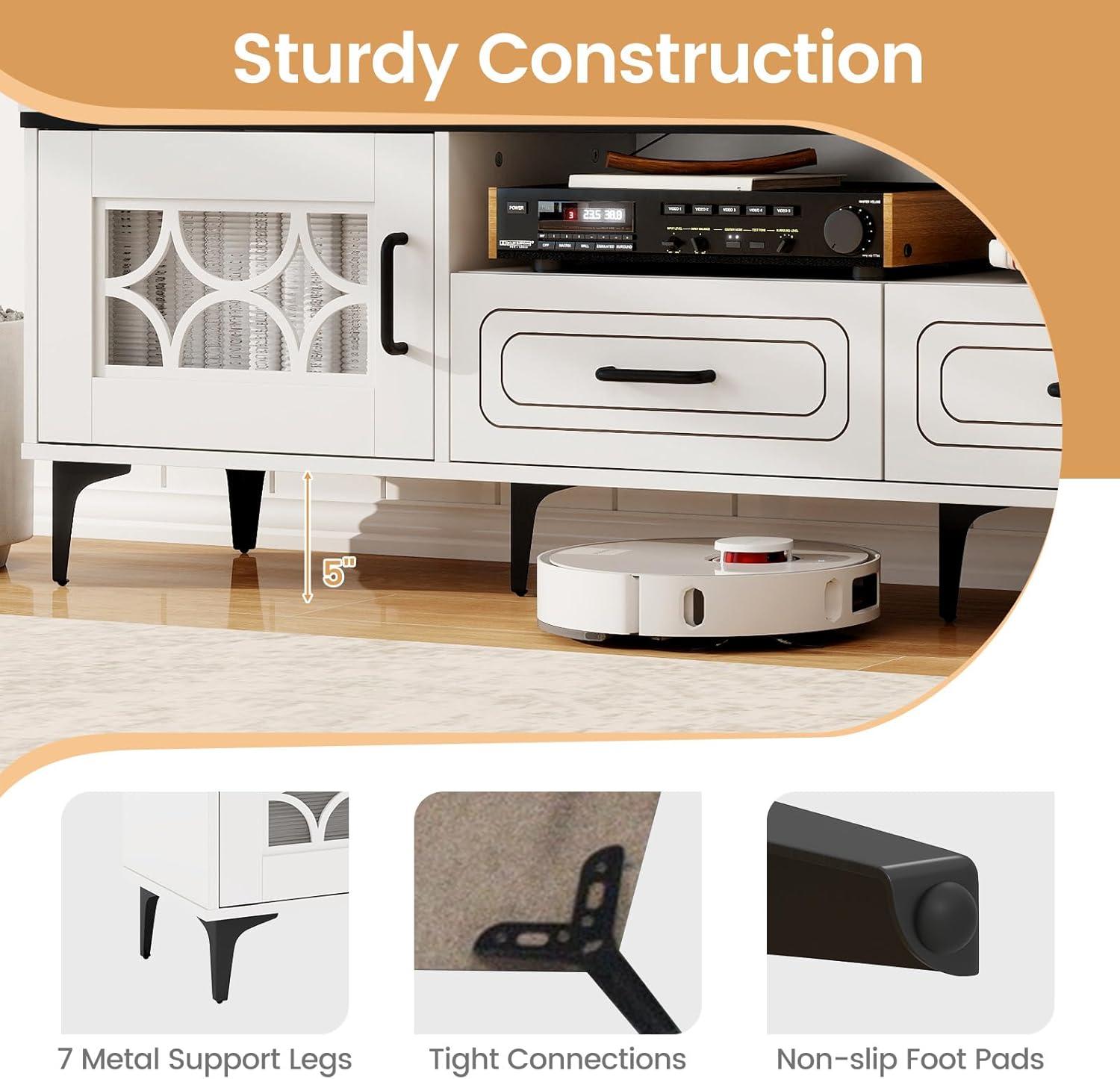 Not only does it provide a stylish platform for your television and decoration, but it also offers ample storage with 2 side cabinets, 2 drawers, and an open compartment to keep your media devices and accessories neatly organized. Crafted with sturdiness in mind, this console features 7 metal support legs, tight connections, and non-slip foot pads to ensure a sturdy and stable foundation for your electronics. Perfectly blending farmhouse&modern design with practical functionality, this TV stand's vintage transparent doors make it a charming addition not just for your living room but also for your bedroom, seamlessly integrating with any decoration style.