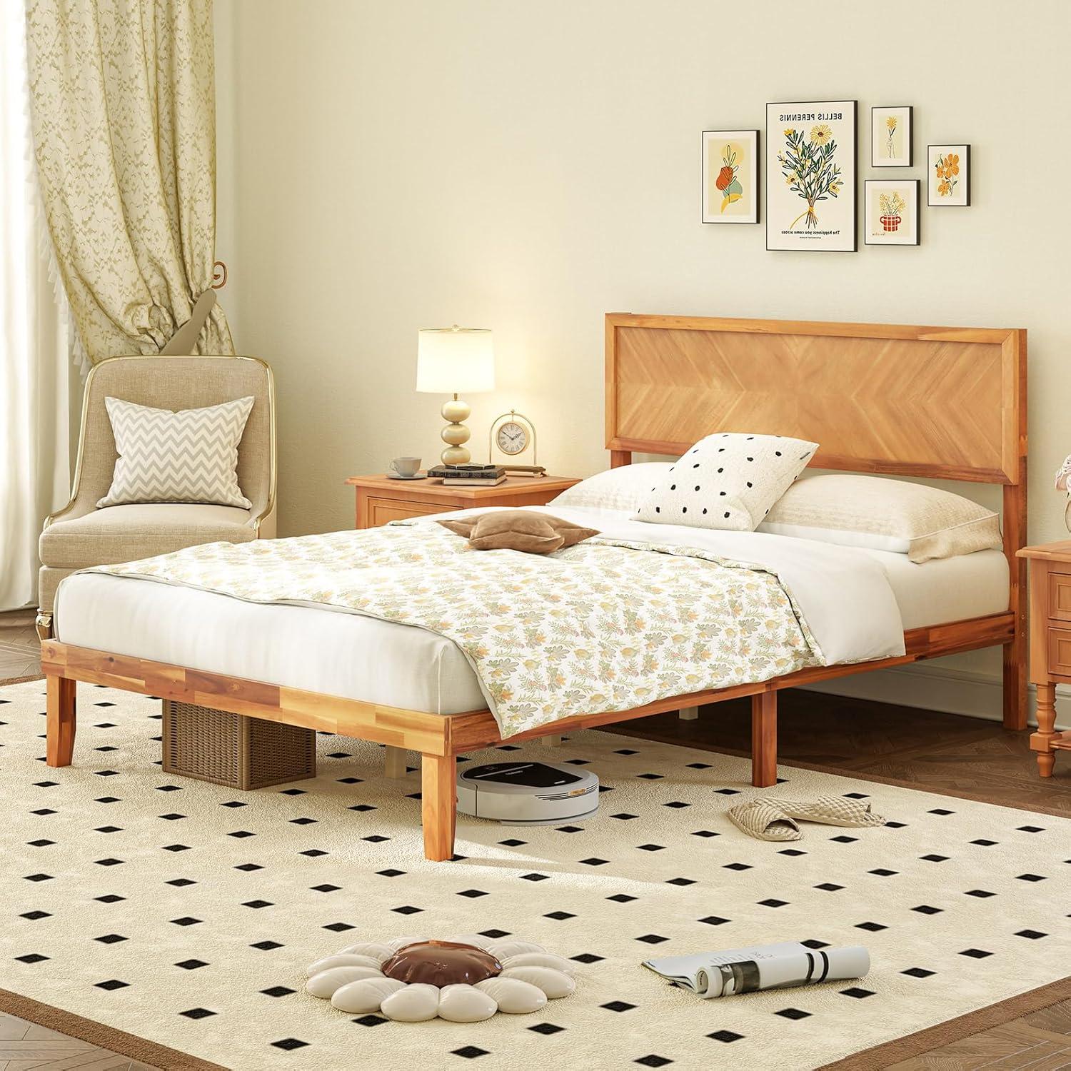 The retro-inspired headboard adds a touch of elegance to your bedroom and seamlessly blends with various interior decoration styles. Constructed with high-quality acacia wood and reinforced plywood slats, this bed frame is built to last. Plus, middle support legs and adjustable foot pads offer added stability. Otherwise, the ample clearance allows for convenient storage of various items, helping you maintain a clutter-free bedroom. Ideal for anyone who values both functionality and style, this solid wood bed frame is a superb choice.