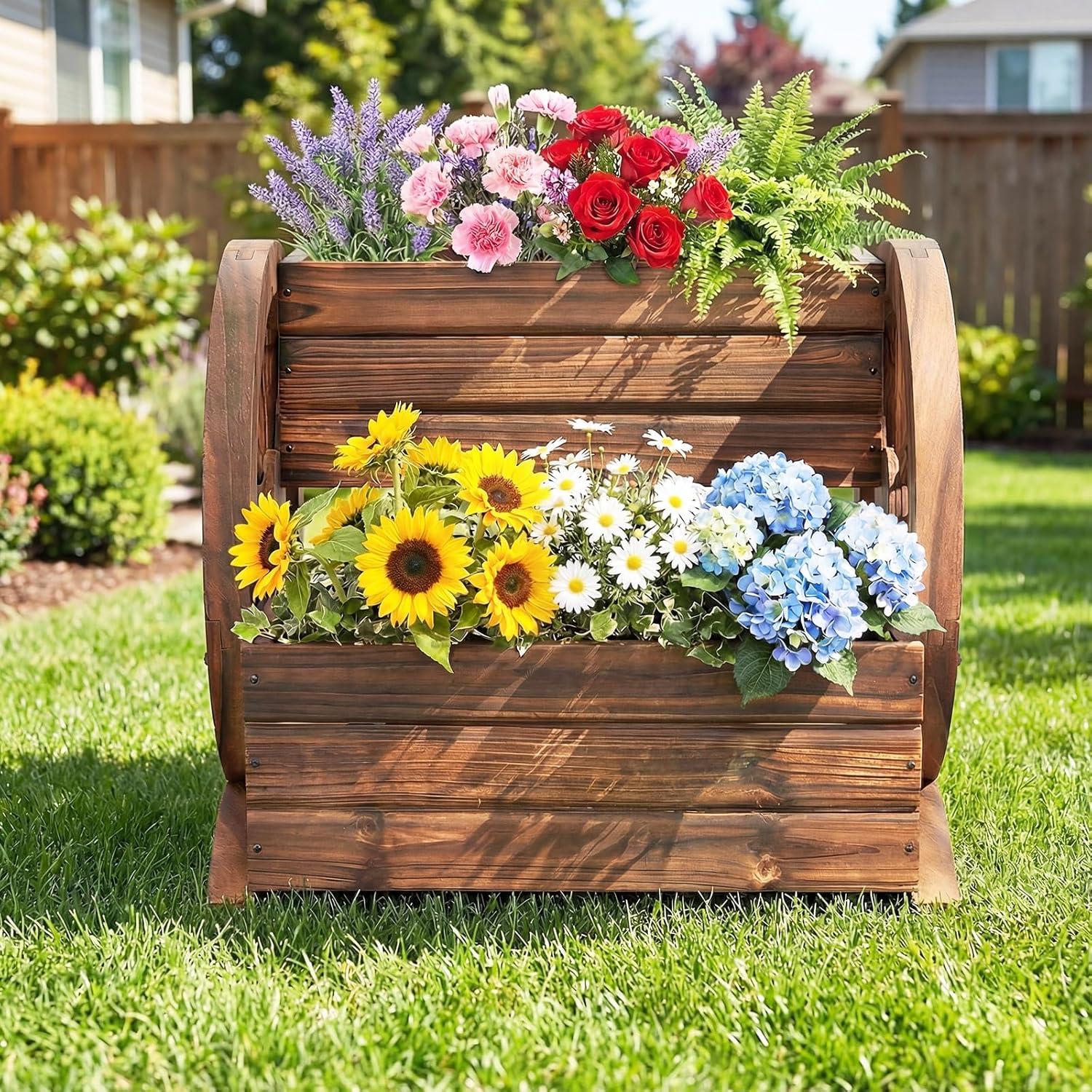 Featuring a 2-tier layout, the vertical raised garden bed offers ample room for diverse plantings, allowing you to neatly segregate vegetables, herbs, and flowers for a well-organized and thriving garden display. Expertly crafted from carbonized fir wood, the rugged construction ensures durability, while maintaining its antique charm through every season. Thoughtfully integrated drainage holes protect roots from waterlogging and foster vigorous plant growth. With its iconic wagon wheel accents and a beautifully charred wood finish, the rustic flower plant stand stands out as a striking focal point for patios, balconies, or cozy corners. Blending classic charm with everyday utility, it’s also the ideal solution for showcasing potted plants or decorations.
