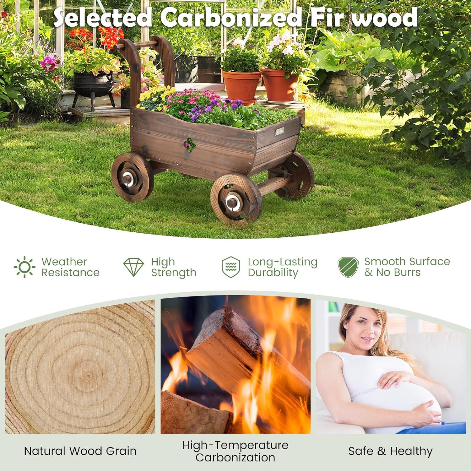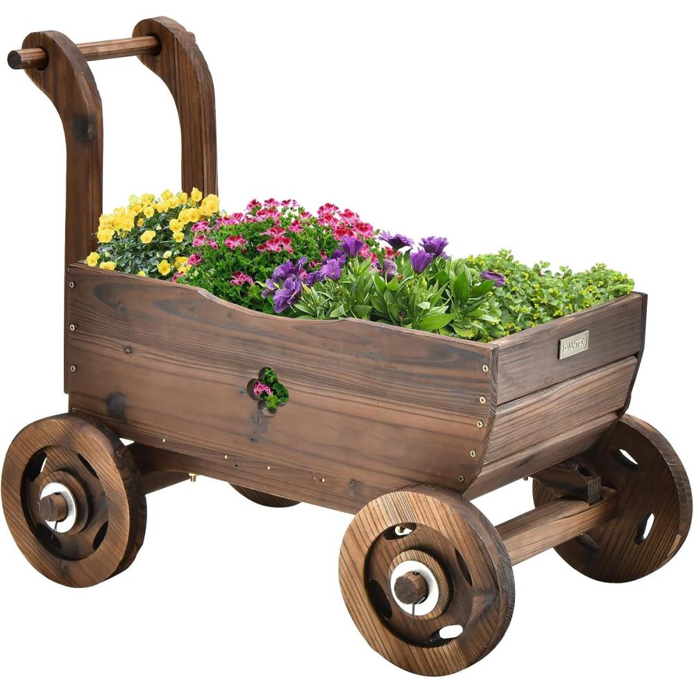 Our wooden wagon cart measures 27” x 15” x 21” (L x W x H) and the planter box measures 19.5” x 10.5” x 6” (L x W x H), providing enough space for cultivating flowers, herbs, vegetables, fruits, and more. It can not only be used as a garden planter, but also served as a decorative flower cart or a flowerpot stand. You can place some gifts or holiday decorations on it, making it a highlight of your living space. Furthermore, the wooden planter is crafted with selected carbonized fir wood, which is characterized by excellent weather resistance and good sturdiness, ensuring long-term use. Thanks to the drainage hole and gaps on the bottom, plants and roots would keep breathable. With the help of 4 wheels and an ergonomic handle, you can easily move the cart anywhere you want. Adopting a unique wagon shape and vintage appearance, this wooden planter box can perfectly blend into any indoor or outdoor decor.