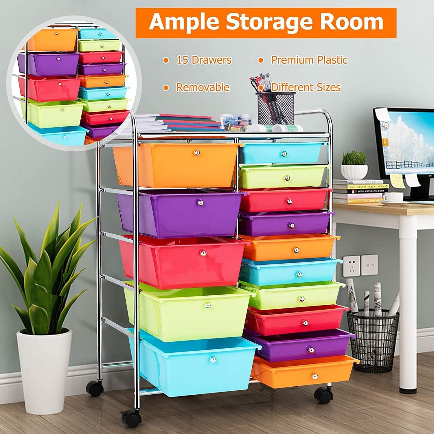 Our 15 drawer rolling storage cart includes 5 bigger drawers and 10 smaller drawers, which provide enough storage space. It is Ideal to arrange your different stuff at Office, Home, School and Garage Or Just About Anywhere Organization Is Needed. Made of Chrome Steel Framed and plastic Drawer Organizer, this 15-drawer rolling cart is durable enough to serve you for a long time. Four universal wheels will help you move it easily. Do not hesitate, to buy one!